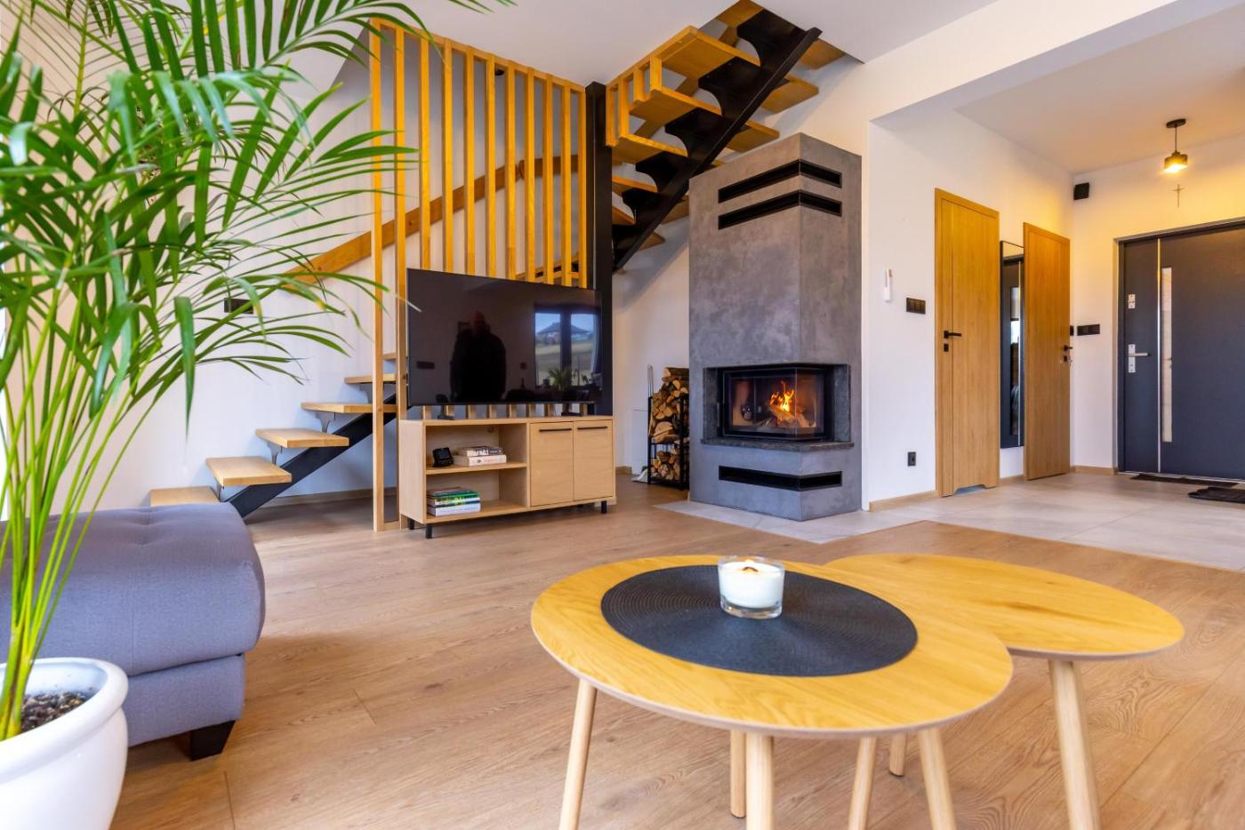Dom z 3 sypialniami. This holiday home boasts a spa bath, sauna and fireplace. Providing free toiletries and bathrobes, this holiday home includes a shared bathroom with a walk-in shower and a hairdryer. The well-fitted kitchen features a stovetop, a refrigerator, a dishwasher and an oven. The spacious air-conditioned holiday home provides a flat-screen TV with streaming services, a washing machine, a private entrance, a tea and coffee maker as well as garden views. The unit offers 5 beds. Dom wakacyjny - 8 osobowy. Powierzchnia pokoju ok.: 120 mkw.